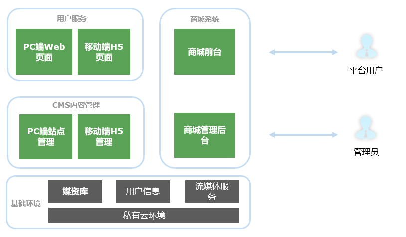 根据系统的实际业务形态,主要包含三个大的功能模块:PC端WEB页面、移动端H5页面、后台管理系统。