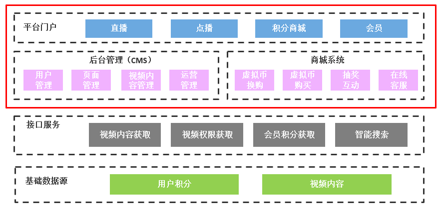 后台管理系统负责维护前台页面的布局与内容,接口对接。主要功能包括:视频内容管理、文章内容管理、素材库管理、banner管理、推荐模块管理、权重配置、接口对接等。